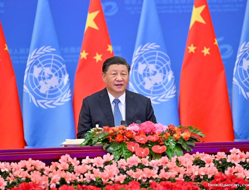 金秋时节的北京,秋高气爽,云淡风轻。主会场人民大会堂金色大厅内,灯光璀璨,鲜花绽放。中华人民共和国国旗和联合国旗交相辉映,联合国各会员国国旗组成的旗阵气势恢宏。