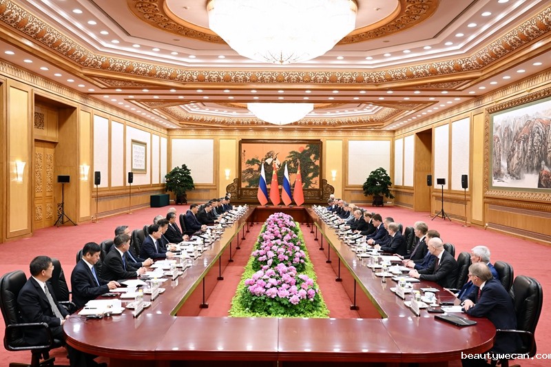 普京表示,我很高兴在就任新一届俄罗斯总统后再次访华。去年3月习近平主席也在连任后不久即对俄进行国事访问。这是我们两国的友好传统,表明双方对加强新时代俄中全面战略协作伙伴关系的高度重视。今年是中华人民共和国成立75周年,也是俄中建交75周年,值得我们共同庆祝。发展俄中关系不是权宜之计,不针对第三方,有利于国际战略稳定。俄方愿同中方持续扩大双边合作,密切在联合国、金砖国家、上海合作组织等框架内沟通协作,推动建立更加公正合理的国际秩序。
